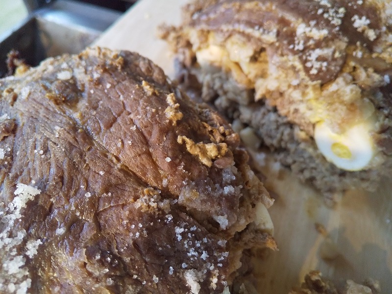 合いびき肉を豚バラで包みその周りを塩で包みダッチオーブンで